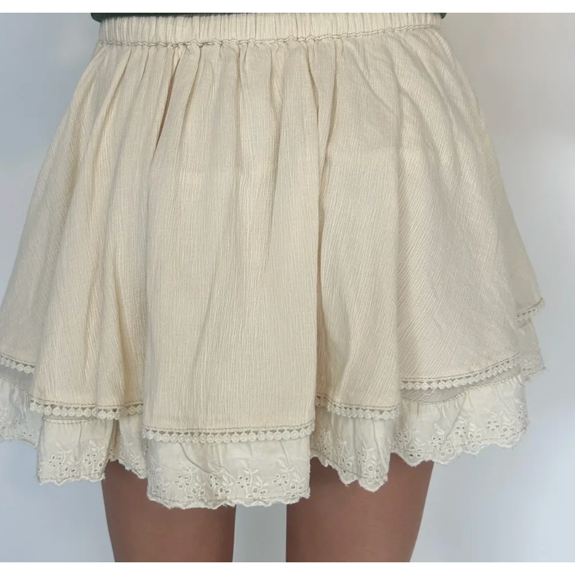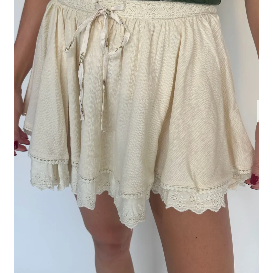 Layer on boho charm with this Free People Lady Tulip Mini Skirts textured design and artisanal details. A crochet-lace waistband frames the waist while delicate eyelet embroidery traces the hem. Effortlessly romantic and perfect for creating free-spirited looks.